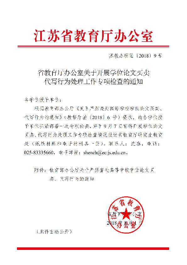 附件1:《省教育厅办公室关于开展学位论文买卖、代写行为处理工作专项检查的通知》(苏教办研函[2018]9号)