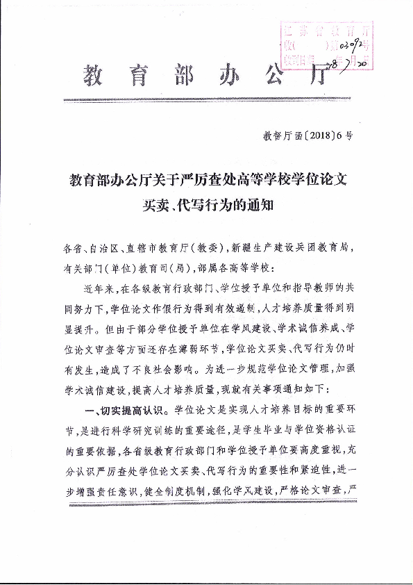 附件2:《教育部办公厅关于严厉查处高等公司学位论文买卖、代写行为的通知》(教督厅函[2018]6号)