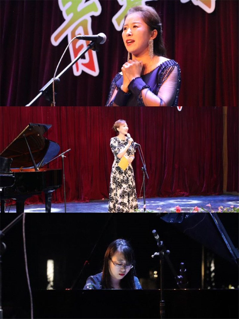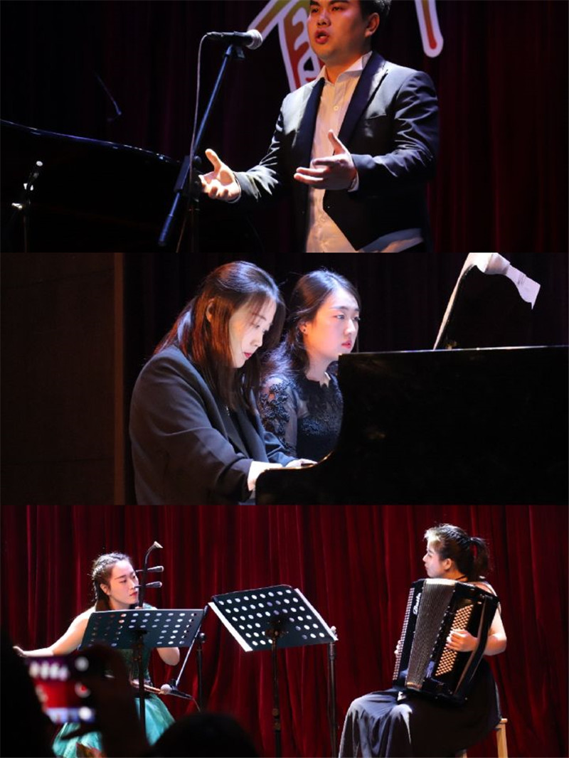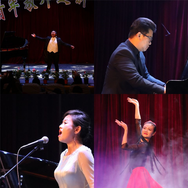 音乐会以刁冠南、许蕴彰老师分别演奏的《夕阳箫鼓》《彩云追月》两首亲切、典雅的中国风格钢琴曲拉开帷幕,希玛、朱刘伟、周振惠、任思源老师分别为大家献上《布里巴》《我怎样去爱你》《我的深情为你守候》《再见青春》中外经典歌曲,茅华梅、张思艳、朱艳、姚尉老师分别为大家带来的《秦生,你还好吗》《主人,你听我说》《冰冷的心》《今夜无人入眠》中外歌剧咏叹调,展示出青年教师们高超的作品驾驭能力和精湛的艺术表现力;孙颖、高菲菲老师的二胡、手风琴二重奏《赛马》声音颗粒干净,珠联璧合;熊颖老师的古筝协奏《婵歌》琴人合一,意境深邃;崔亚琳老师的舞蹈《维族姑娘》青春柔美、别具一格;徐萌老师作曲并演奏的钢琴独奏《太湖美主题变奏曲》旋律优美,技术娴熟,展示了江南太湖的迷人景色;高一航老师、孙冉老师分别带来的钢琴独奏《月光奏鸣曲》第三乐章、《降b小调第二号谐谑曲》技巧高超,速度流畅,充分表现了贝多芬斗志激昂和肖邦悲壮激昂的不同情绪,感受了西方古典音乐和浪漫音乐的不同魅力。整场音乐会为师生们带来了一场高雅的视听盛宴,赢得现场观众的满堂喝彩。