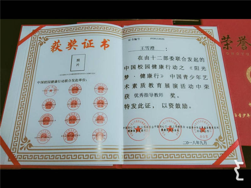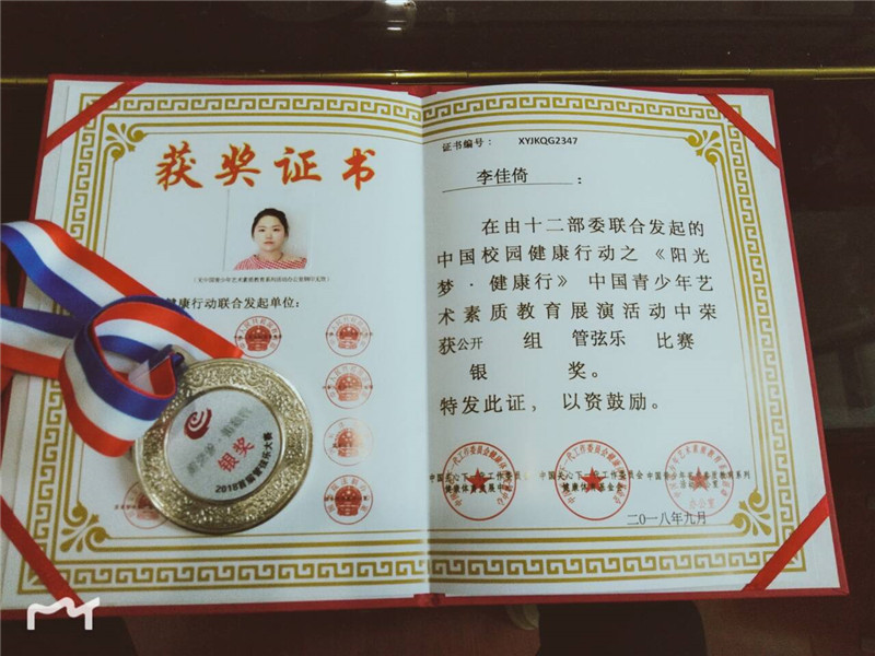 今年8月份,公司王雪澄老师指导李佳倚同学参加全国青少年艺术素质教育展演活动,并获得公开组管弦乐比赛银奖,王雪澄老师获得“优秀指导教师”奖。