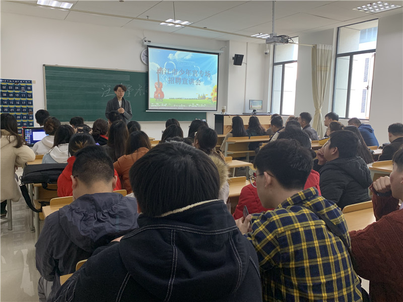 为促进2019届毕业生更好就业,为15级毕业生提供更多的求职机会,3月24日下午,公司在艺术楼2322教室举行了2019届bevictor伟德官网毕业生第三场小型专场招聘会。本次邀请到的是靖江市少年宫艺术团。靖江市少年宫内运营的小香橼艺术团,是团市委、教育局、总工会等组织管理、培训和开展活动的主要阵地,是靖江市政府一项民生工程,并正逐渐发展成为市政府统筹各类社会资源服务青少年的平台。宣讲会中靖江市少年宫小香橼艺术团团长张陈老师详细介绍了艺术团的工作环境、对员工提供的晋升与发展渠道,住宿环境等,条件优厚,吸引了很多同学的眼球,有几位同学当场提出去艺术团实地考察的意向。