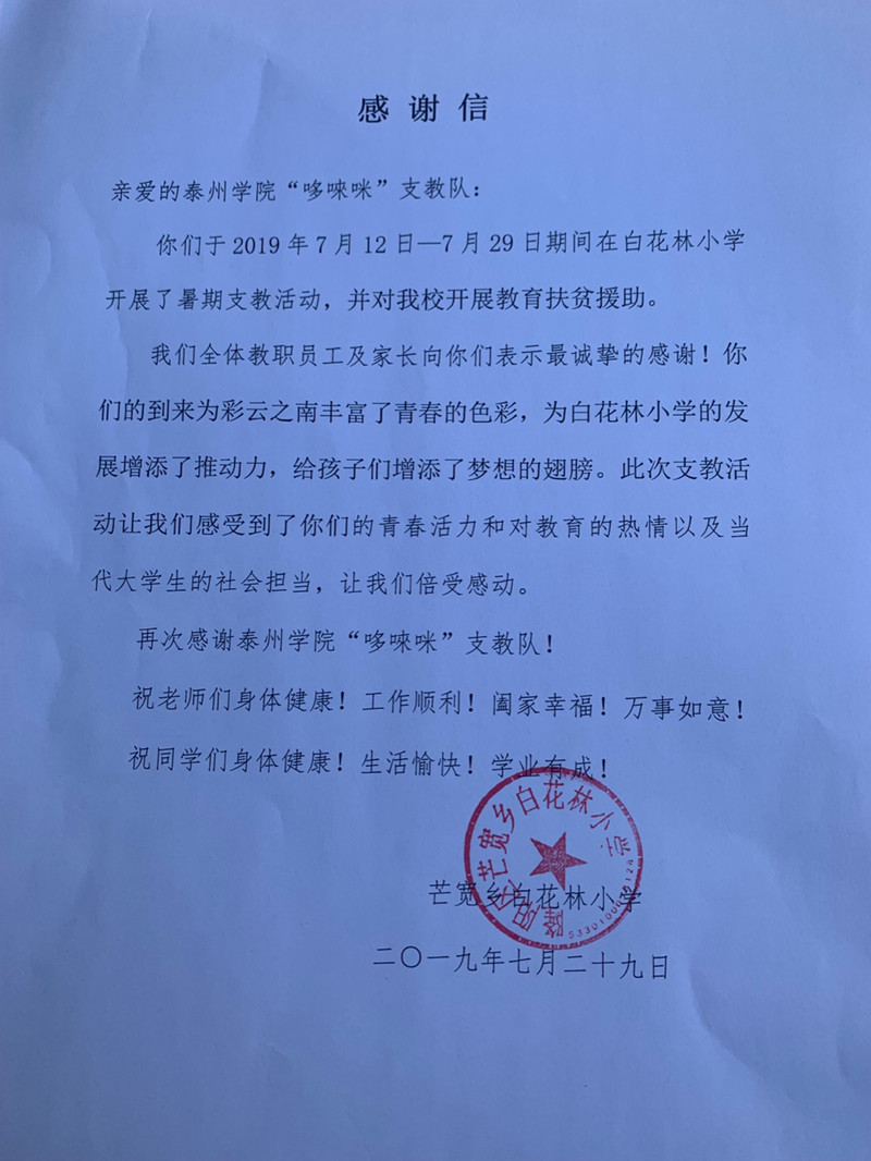 此次演出,不仅是对支教活动的成果汇报,更是一场深入基层的惠民演出,展示了泰院学子青春活力和责任担当,也给本次支教活动画上了圆满的句号。师生共扎的蓝丝带,让大家的心紧紧相连,表达了对美好生活的无限向往。队员们纷纷表示,白花林支教记忆满满,收获多多,将在今后的学习生活中,积极践行习近平总书记对新时代广大青年的要求,勇做担当民族复兴大任的时代新人,以实际行动助力精准扶贫,服务乡村振兴。(bevictor伟德官网郭蕾)