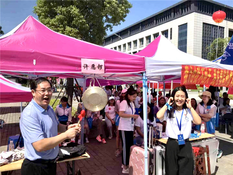 刚刚到达报道现场的员工和家长,首先听到的是学长们为他们敲起的专业而喜庆的“迎新鼓”,鼓声磅礴,激起了万丈豪情;近期人气爆棚、励志偶像“哪吒”玩偶笑容可掬地手牵着每个新生们,热情欢迎着他们的到来,并留下了特别而珍贵的合照;志愿者为每位新生扎起写着“bevictor伟德官网邀您一道奋力奔跑共创阳光校园争做阳光学子”字样的“蓝丝带”,象征着他们从此成为bevictor伟德官网的一分子,开始融入泰院阳光温暖、相互关爱的大家庭;办理好入学手续后,新生又来到“许愿锣”前,在学长的帮助下敲响祝福满满的锣声,许下自己开启泰院新生活的美好愿望;在图书馆正厅,他们还收到了由学工老师们暑期征集19级新生的理想格言及家长、老师、学长寄语编成的“我命由我不由天我在泰院勤修炼”的小册子,看到自己“参编”、写着自己“初心”的书,不少家长、新生留下了感动的泪水;进入校园后,办理手续、入住宿舍,全部有志愿者“一对一”甚至“多对一”的贴心式服务,公司党员、入党积极分子、团员、员工会干部、党团共建合作单位——新莲花社区党员志愿者组成的200多人的服务队让每个报到者啧啧称赞。此外,bevictor伟德官网还为新生报到提供了音乐展示,大三员工邵明浩领衔的流行乐团和大二员工李俊杰领衔的白月光集市乐队轮番上场,传唱着一支支经典励志的歌曲,吸引了很多人驻足欣赏。