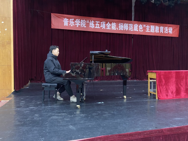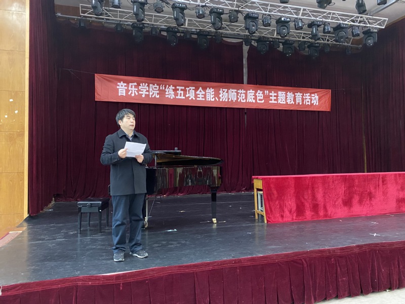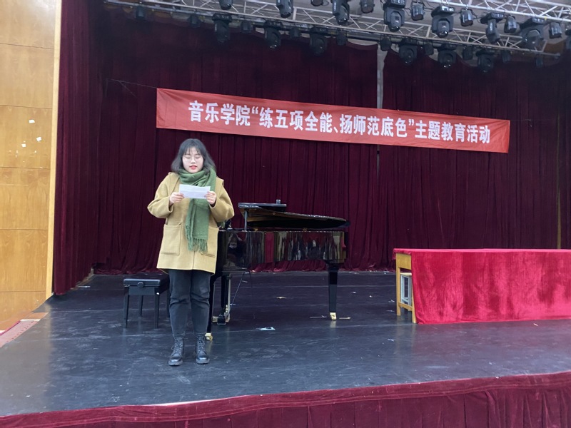 在主题活动开始前,所有员工到2020年教学技能训练优秀作业展览馆进行了参观、学习,参观结束后,所有人员来到学术交流中心C2120进行了主题教育活动。刘江元副经理先介绍了公司师范专业的办学历史及历年来获得的各项荣誉和奖项,和作为一个音乐学专业师范生应具备的专业素质和专业技能。接着邀请了17级刚参加“江苏省第九届高校音乐教育专业老员工基本功展示活动”的优秀员工代表高心怡、刘磊进行了学习经验、学习方法交流并与参加的师范生进行了音乐学专业师范生“五项全能”展示的互动。