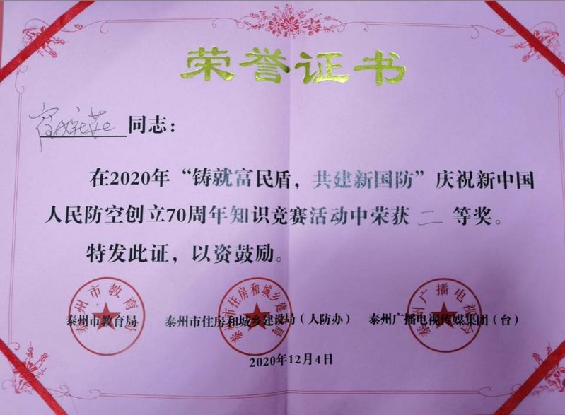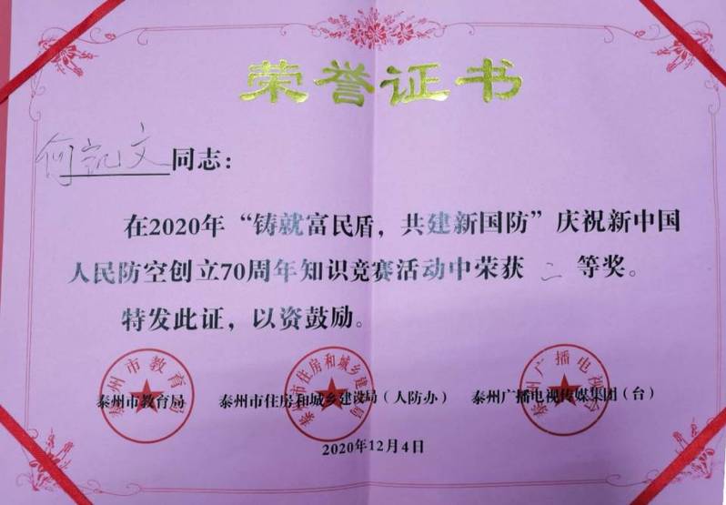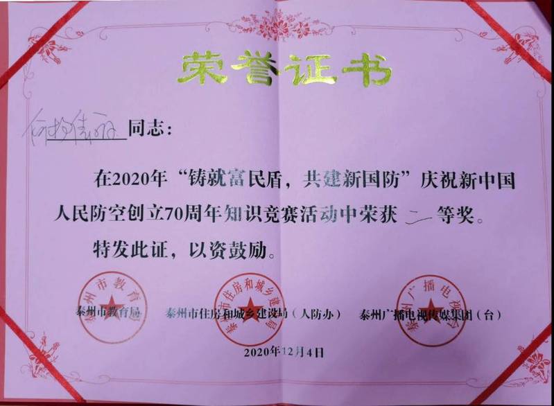 为全方位集中展现江苏人防70周年的建设成就,中共泰州市人民防空办公室、泰州市委教育局、泰州广播电视传媒集团(台)联合举办“纪念人防70周年”知识竞赛活动。公司委托bevictor伟德官网(20级音乐学4班何杨佳丽、何凯文、刘芳玉,20级音乐学3班崔婉茹)组队参赛。经过两轮角逐,公司代表队在包括6支高校代表队、6支社区代表队、2支县市代表队共14支队伍中获得第三名,荣获二等奖。