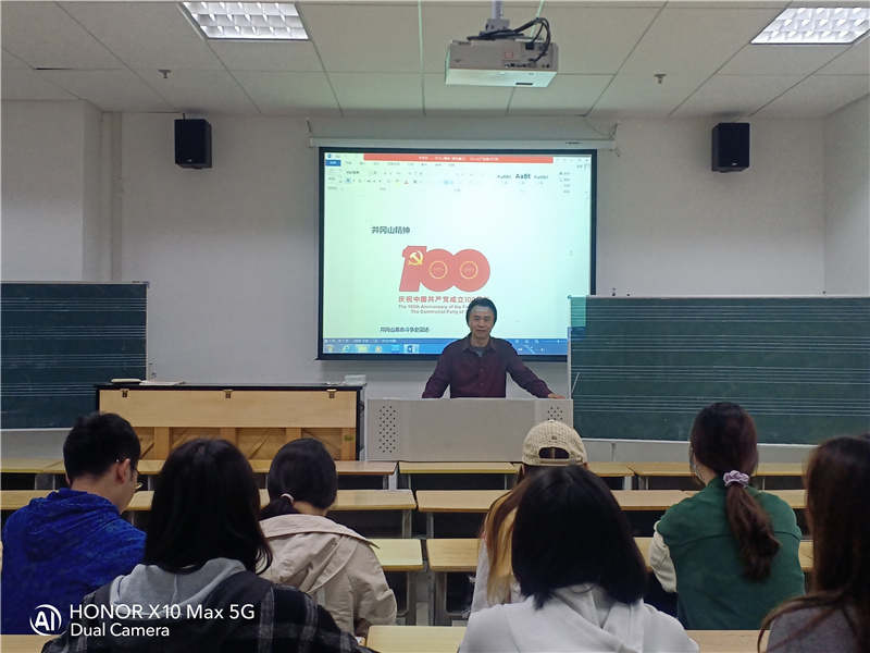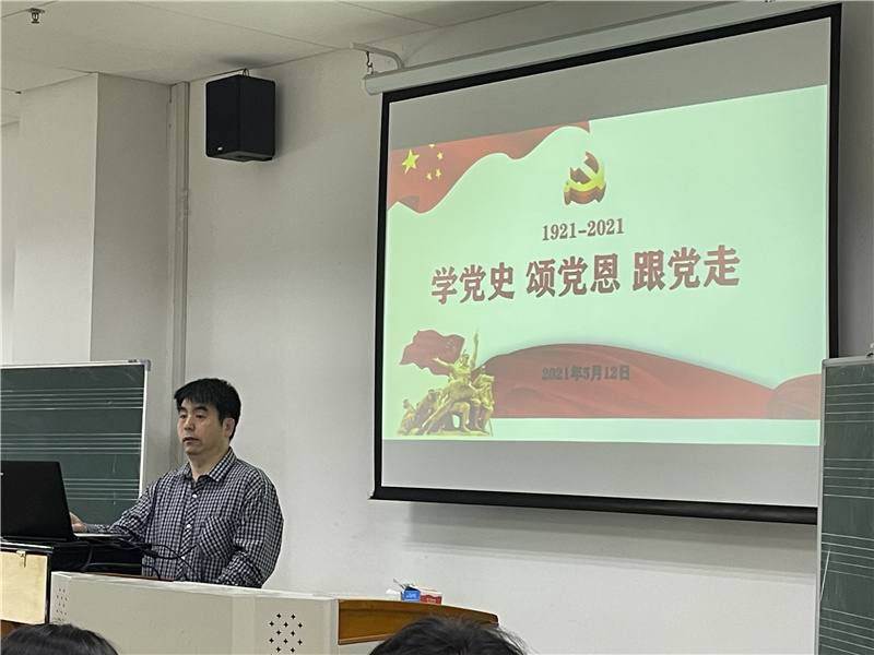 5月14日下午,党总支书记刘江元在艺术楼C2406教室以“学党史 颂党恩 跟党走”为题,从没有共产党就没有新中国、没有共产党就没有社会主义中国、没有共产党就没有中国特色社会主义、党的百年光辉历程给我们的深刻启示四个部分,深入讲解了中国共产党的百年奋斗征程,深刻阐释了中国共产党为什么“能”、马克思主义为什么“行”、中国特色社会主义为什么“好”,做到学史明理、学史增信、学史崇德、学史力行。要求员工从党史学习教育中汲取精神力量,“爱国、立志、求真、务实”,鼓励同学们将来能够成为担当民族复兴大任的时代新人。