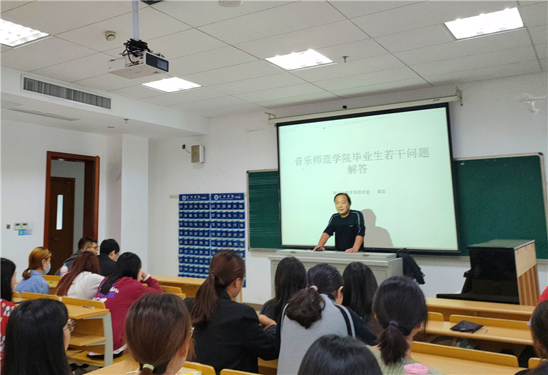 秦军主任就近几年考编的情况和内容做了总结,音乐师范生目前考编越来越难,录取率也越来越低,好多中小学音乐老师都已经达到了饱和的状态,他提醒大家,第一,对于专业好和理论知识好的同学,一定要奋力一搏,努力争取一次上岸,对于专业技能稍微薄弱一点儿的可以在实习期间,或者暑假抓紧就自己薄弱的环节刻苦练习,也要做好打几年硬仗的准备。第二,就音乐教师考编的内容进行了指导,他说,笔试部分除心理学、教育学知识外,主要是音乐学科知识,包含中西方音乐史、中国民族民间还有一些音乐欣赏、音乐常识,知识面比较广。面试要求大家具有扎实的模拟授课基本功和钢琴、声乐、即兴伴奏等方面的专业技能非常优秀。