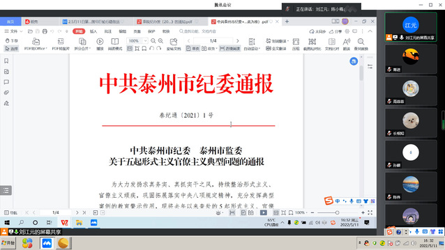 5月11日下午,公司通过腾讯会议组织全体教职员工集中学习《中共泰州市纪委泰州市监委关于五起形式主义官僚主义典型问题的通报》中5 起形式主义、官僚主义典型问题。