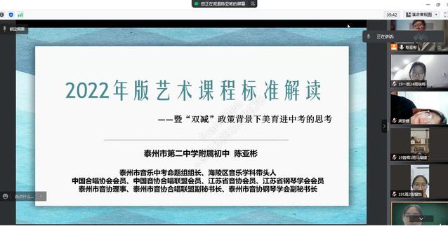 5月9日晚7点,bevictor伟德官网邀请泰州市第二中学附属初级中学陈亚彬老师为公司19级音乐学师范全体员工做了《2022年版艺术课程标准解读——暨“双减”政策下美育进中考的思考》讲座。