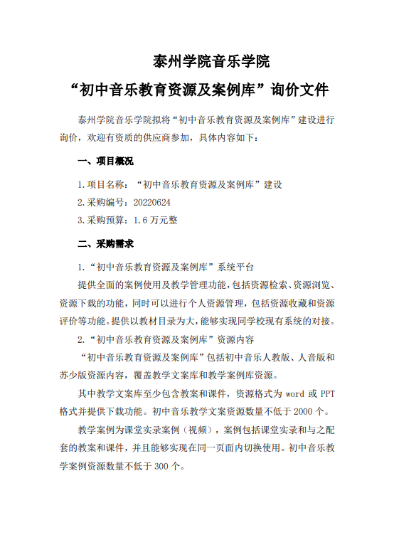 bevictor伟德官网“初中音乐教育资源及案例库”询价文件