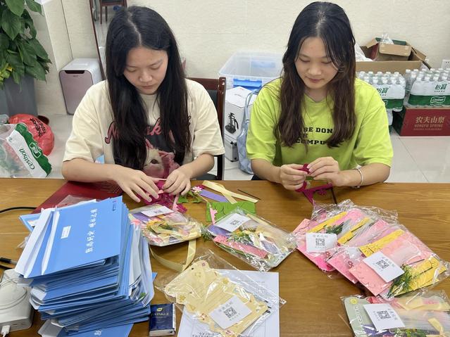 同学们纷至员工工作办公室,领取纸绳、花蕊以及贺卡后,迫不及待地开始制作。剪取花瓣、黏制花瓣、粘贴花蕊、制作花朵,略显复杂的程序考验着每一位同学的动手能力。同学们将完成的手工作品敬献给亲爱的老师们,表达敬意与感激。