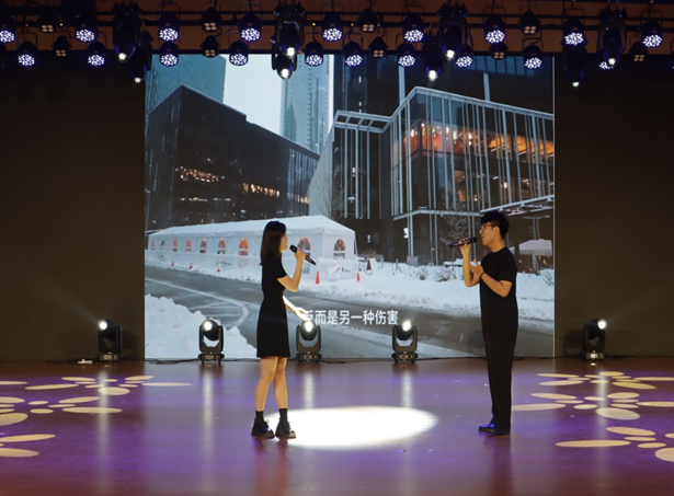 刘子杰、张浩然、梁清露、王玥琪四位同学领唱,22音乐学4班全体同学合唱的歌曲《我的未来式》将大家带到曾经的美好回忆中。
