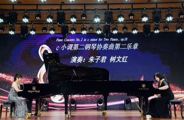 音乐会在朱子君、树文红两位新老教师携手演绎的双钢琴拉赫玛尼诺夫《c小调第二钢琴协奏曲》的美妙旋律中推向高潮,画上了圆满的句号。