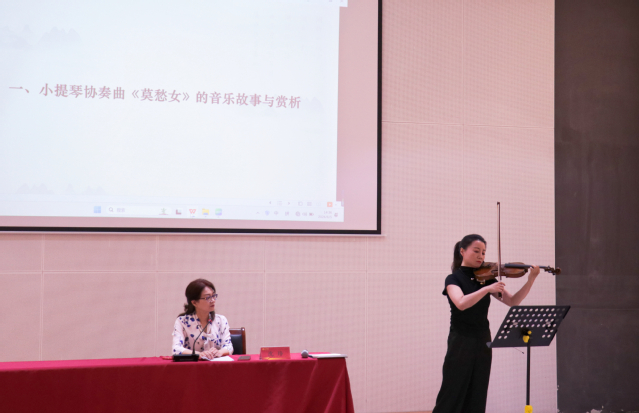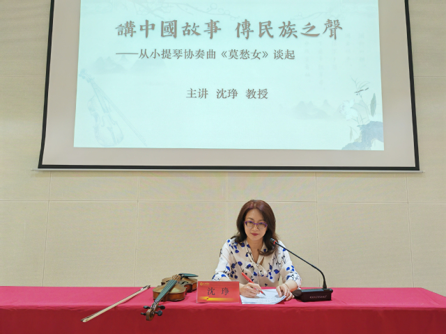 沈琤教授以“讲中国故事、传民族之声——从小提琴《莫愁女》协奏曲讲起”为题,带领师生聆听、赏析了小提琴协奏曲《莫愁女》的精彩演奏,解读了作品的音乐内涵和流传千年的民间爱情故事,以独特视角剖析了中西文化的异同,阐述了新时代文化自信的重要性,让在场的师生在视觉与听觉的双重享受中,真切感受到中国故事的无限魅力和民族音乐的深厚底蕴。