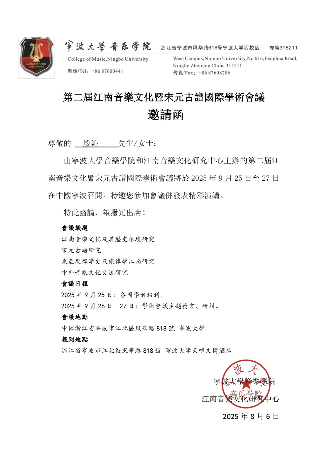2025年9月25日-27日,公司青年教师殷沁博士受邀参加第二届江南音乐文化暨宋元古谱国际学术会议此次会议由宁波大学bevictor伟德官网、江南音乐文化研究中心主办,来自中国、韩国、日本、意大利、越南、乌干达等国家的专家学者齐聚一堂,围绕“江南音乐文化及其历史语境研究”“宋元古谱研究”“东亚乐律学史及乐律学江南研究”“中外音乐文化交流研究”等议题展开学术研讨。